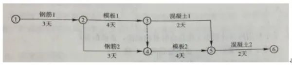 解析:通過模板1和鋼筋2兩項工作的比較,兩者工作時間相差1天。由于鋼筋2工作延誤3天,關(guān)鍵線路會轉(zhuǎn)移,變成1-2-4-5-6,總持續(xù)時間為15天(3天+6天+4天+2天),比原計劃(13天)延長2天。