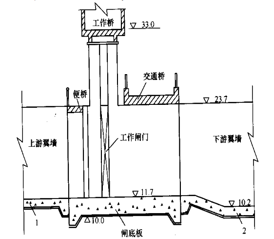解析:1.工程等別為Ⅱ等;閘室級(jí)別為2級(jí);圍堰級(jí)別為4級(jí)。圖中:1為鋪蓋、2為護(hù)坦(消力池)。