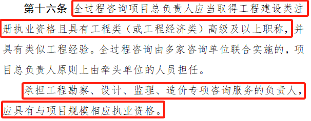 承擔(dān)工程勘察、設(shè)計、監(jiān)理、造價等專項咨詢服務(wù)的負(fù)責(zé)人,應(yīng)具有與項目規(guī)模相應(yīng)執(zhí)業(yè)資格。