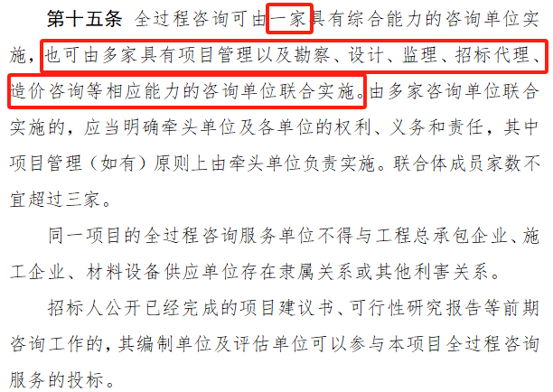 全過程咨詢可由一家具有綜合能力的咨詢單位實施,也可由多家分別具有項目管理以及勘察、設(shè)計、監(jiān)理、招標(biāo)代理、造價咨詢等相應(yīng)能力的咨詢單位聯(lián)合實施。聯(lián)合體成員家數(shù)不宜超過三家。