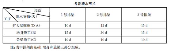 某施工單位承接了一4×20m簡支梁橋工程。橋梁采用擴大基礎(chǔ),墩身平均高10m。項目為單價合同,且全部鋼筋由業(yè)主提供,其余材料由施工單位自采或自購。在離本工程不遠的江邊有豐富的砂源,經(jīng)檢驗,砂的質(zhì)量符合要求。采砂點位于一跨江大橋下游150m處,施工用砂均取自這里。項目部擬就1~3排架組織流水施工,如下表所示。