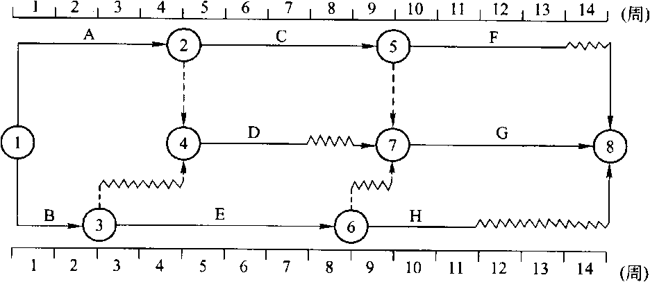 從時標網(wǎng)絡圖中工作E后面直至終點的2條線路來看,E工作的總時差為1周。如果工作E實際進度延誤了4周,則會對原基礎工程施工進度計劃的工期影響3周(4-1=3周)。故B正確。