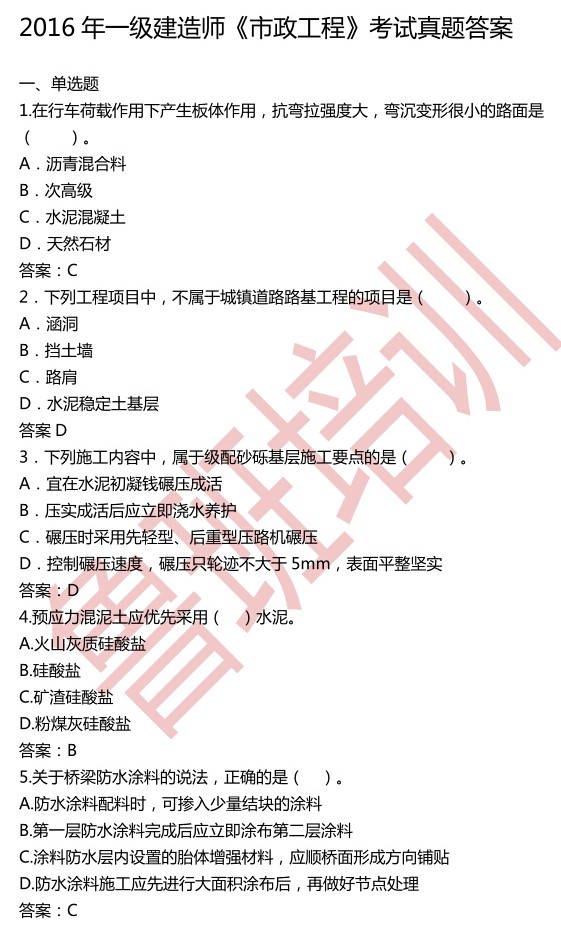 2016年一級建造師《市政》真題及答案