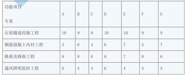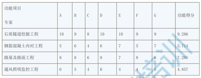 某設(shè)計院承擔(dān)了長約 1.8 公里的高速公路隧道工程項目的設(shè)計任務(wù)。為控制工程成本,擬對選定的設(shè)計方案進行價值工程分析。專家組選取了四個主要功能項目,7 名專家進行了