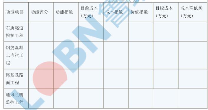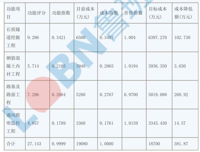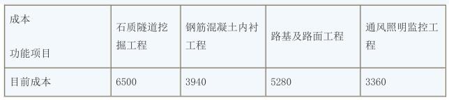 4.成本降低額從大到小排序為路基及路面工程、石質(zhì)隧道挖掘工程、通風(fēng)照明監(jiān)控工程、鋼筋混凝土內(nèi)襯工程。所以功能改進的前兩項分別為路基及路面工程、石質(zhì)隧道挖掘工程。