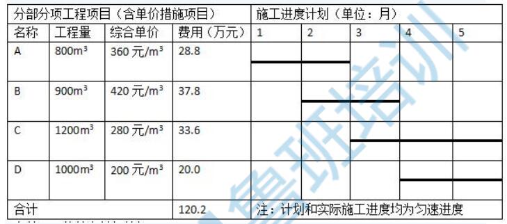某工程項目發(fā)承包雙方簽訂了工程施工合同,工期 5 個月,合同約定的工程內(nèi)容及其價款包括,分部分項工程項目(含單價措施項目)4 項。費用數(shù)據(jù)與施工進度計劃見表 5.1;總價措施項目費用 10 萬元(其中含安全文明施工費為 6 萬元);暫列金額費用 5 萬元;管理費和利潤為不含稅人材機費用之和的 12%;規(guī)費為不含稅人材機費用與管理費、利潤之和的 6%;增值稅稅率為 10%。