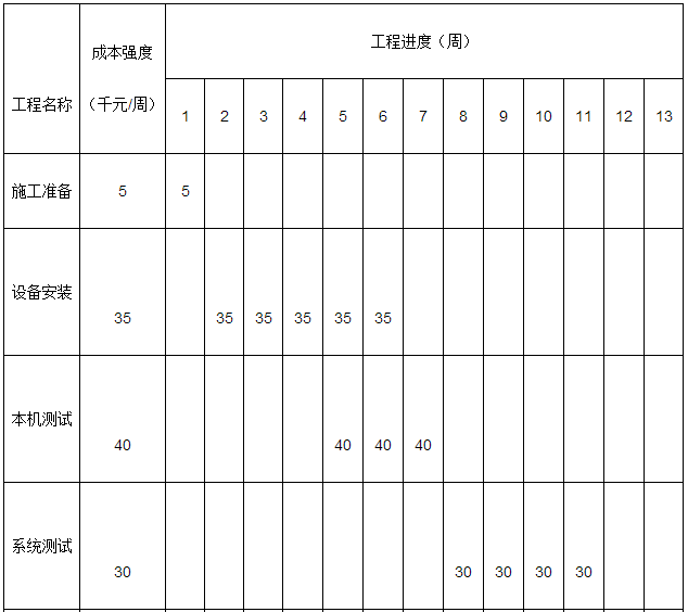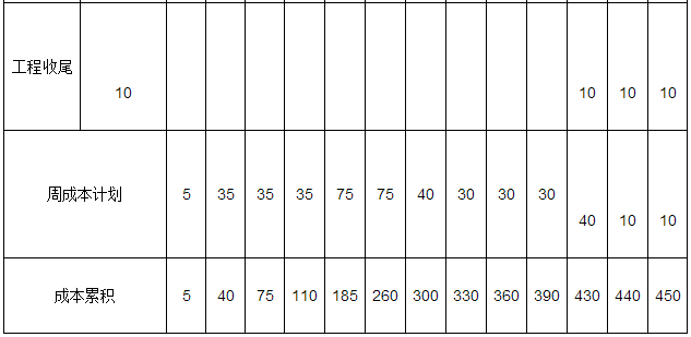 1、根據(jù)橫道圖用直方圖形式繪制,按周編制成本計劃 答:根據(jù)進度計劃橫道圖,繪制進度計劃成本矩陣見下表: