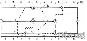 5.【2011年真題】某分部工程時標(biāo)網(wǎng)絡(luò)計劃如下圖所示,當(dāng)計劃執(zhí)行到第3周末及第6周末時,檢查得到的實際進度如圖中的實際進度前鋒線所示。該圖表明( )。