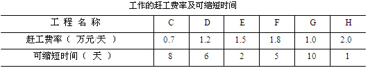 事件一:由于施工單位人員及材料組織不到位,工程開工后第 33 天上班時工作 D 才開始。為了確保按合同工期竣工,施工單位決定調整施工總進度計劃。經分析,各項未完成工作的趕工費率及可縮短時間見下表。