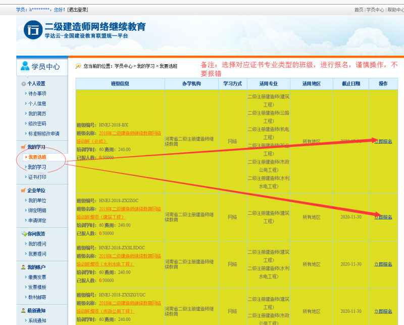 3. 基本信息,證書(shū)信息完成后,點(diǎn)擊左側(cè)【我要選班】菜單,選擇對(duì)應(yīng)證書(shū)專(zhuān)業(yè)的班。