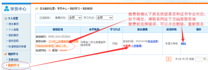 4. 報(bào)名成功后,點(diǎn)擊【我的學(xué)習(xí)】中 【立即繳費(fèi)】鏈接進(jìn)入 繳費(fèi),繳費(fèi)前確認(rèn)報(bào)名班級(jí)適用專(zhuān)業(yè)是否和本人證書(shū)專(zhuān)業(yè)一致。