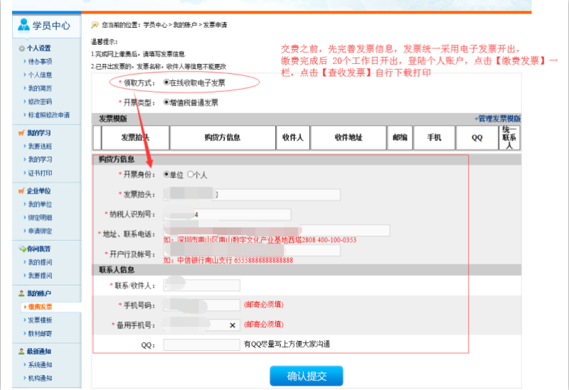 5. 繳費(fèi)前,先完善發(fā)票信息,發(fā)票統(tǒng)一采用電子發(fā)票,繳費(fèi)后20個(gè)工作日開(kāi)出。