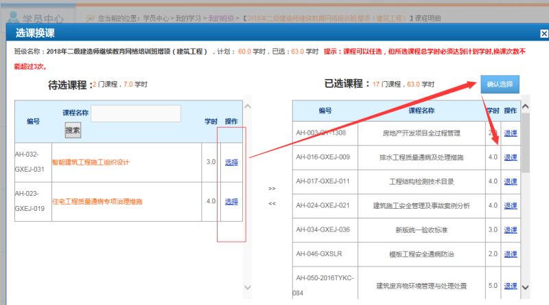 6. 繳費(fèi)完成后,點(diǎn)擊 【我的學(xué)習(xí)】中,【選課學(xué)習(xí)】鏈接進(jìn)去選課,選擇學(xué)時(shí)達(dá)到 60 學(xué)時(shí)即可,最多不超過(guò)65學(xué)時(shí)。
