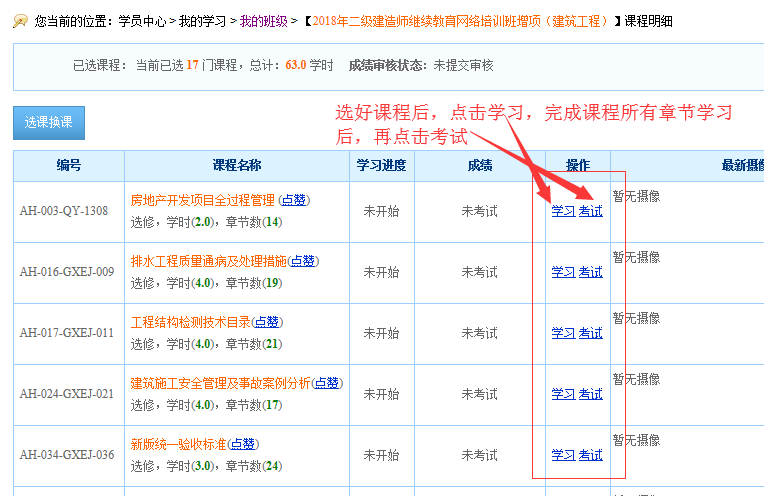 7. 選好課后,點(diǎn)擊學(xué)習(xí),完成1門(mén)課程所有章節(jié)學(xué)習(xí)后,再點(diǎn)擊【考試】。