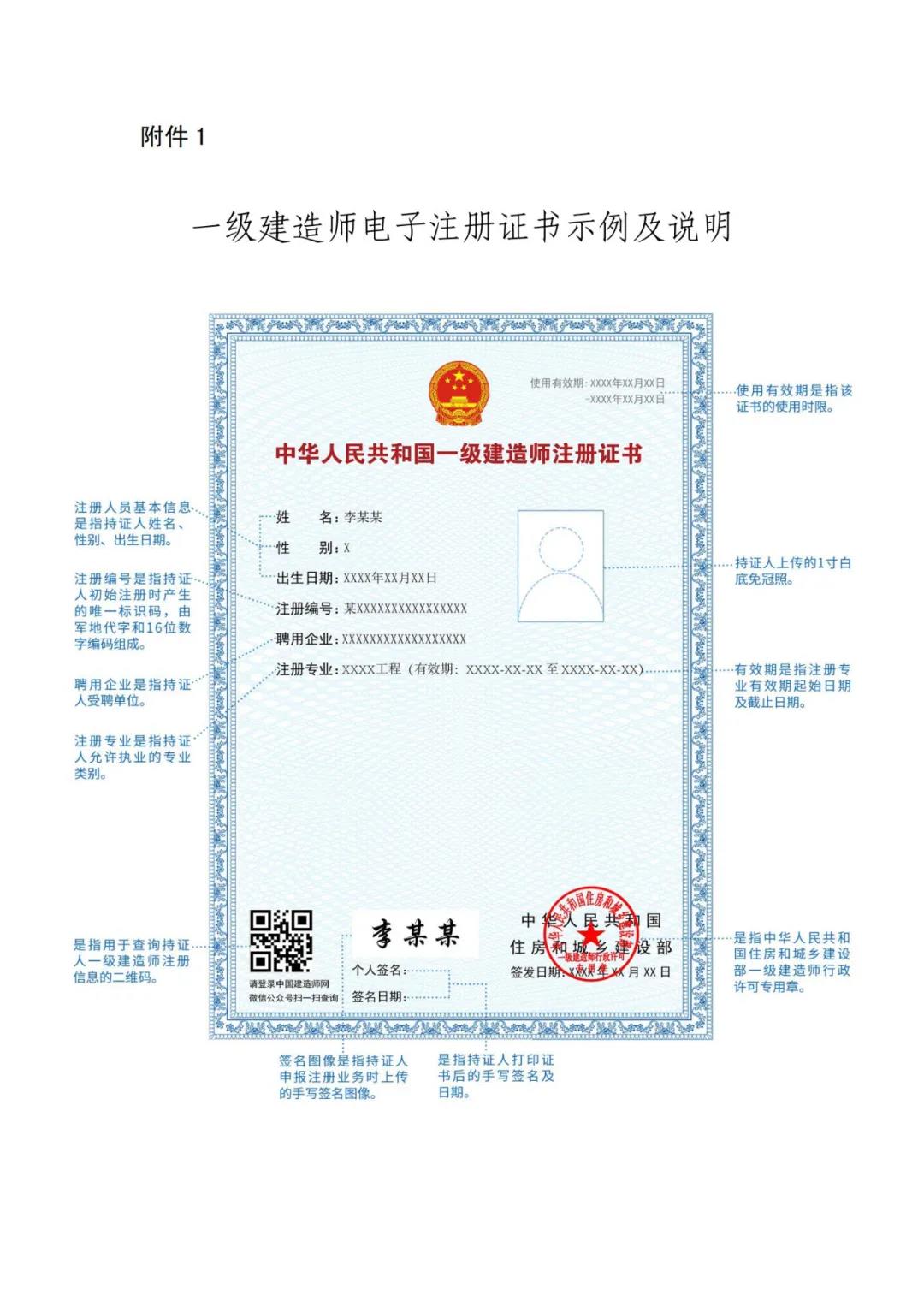 1.自2021年8月1日起,在河北等15個?。▍^(qū)、市)啟用一級建造師電子證書(具體示例及說明見附件1),電子證書式樣按照《全國一體化在線政務服務平臺電子證照一級建造師注冊證書》標準執(zhí)行(具體式樣見附件2)。
