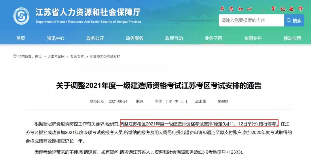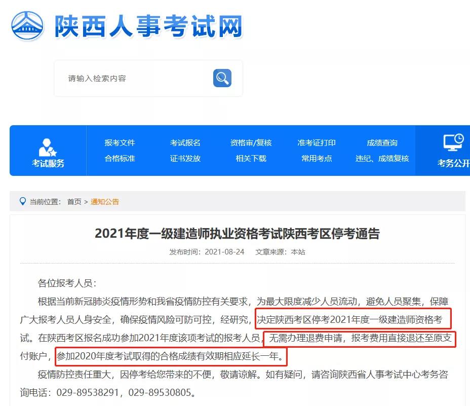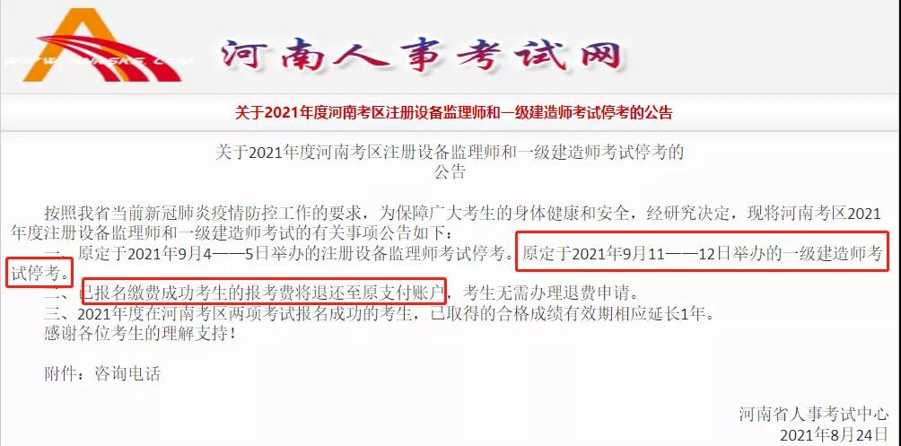 重磅消息!河南人事考試網(wǎng)、陜西人事考試網(wǎng)和江蘇省人社廳今日發(fā)布通告,河南、陜西、江蘇三地2021年一級建造師考試??迹?/strong>報考費用直接退還,2020年考試取得合格成績有效期延長一年。以下是通告原文。