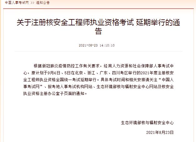 根據(jù)新冠肺炎疫情防控工作有關(guān)要求,經(jīng)商人力資源和社會保障部人事考試中心,原計(jì)劃于9月4日、5日在北京、浙江、廣東、四川考區(qū)舉行的2021年度注冊核安全工程師執(zhí)業(yè)資格全國統(tǒng)一考試延期舉行。具體考試時間和相關(guān)安排請關(guān)注“中國人事考試網(wǎng)”、報(bào)考地人事考試機(jī)構(gòu)網(wǎng)站、生態(tài)環(huán)境部核與輻射安全中心網(wǎng)站及核安全執(zhí)業(yè)資格注冊辦公室子頁面的通知。