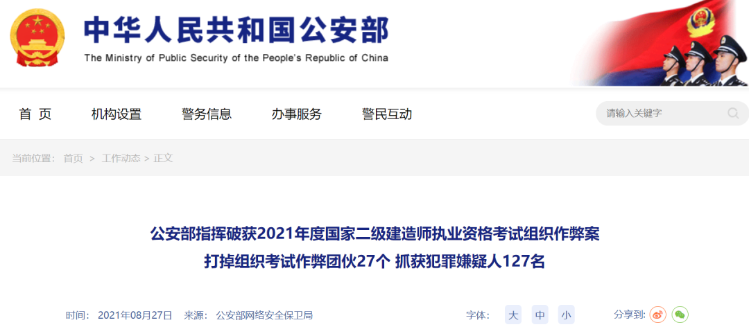 近日,按照公安部統(tǒng)一指揮部署,江蘇、湖北、江西等多省市公安機(jī)關(guān)對(duì)2021年度國(guó)家二級(jí)建造師執(zhí)業(yè)資格考試(以下簡(jiǎn)稱二建考試)組織作弊案進(jìn)行偵辦, 一舉打掉組織考試作弊團(tuán)伙27個(gè),抓獲犯罪嫌疑人127名 ,查獲一批作弊考生,及時(shí)鏟除了試題泄露源頭,有效消除了試題泄露安全隱患,有力維護(hù)了公平公正考試秩序。