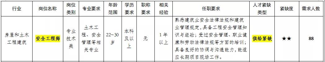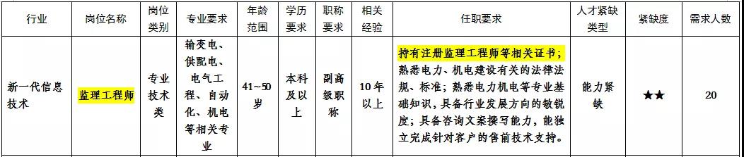 急需緊缺人才目錄模塊以表格方式對包括行業(yè)、崗位名稱、崗位類別、專業(yè)要求、年齡范圍、學(xué)歷要求、職稱要求、相關(guān)經(jīng)驗、任職要求、人才緊缺類型、緊缺度、需求人數(shù)12個要素進(jìn)行分析。