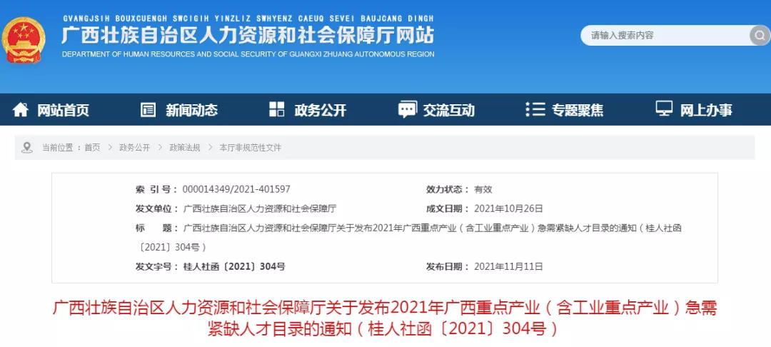 為深入貫徹落實中央人才工作會議和習(xí)近平總書記重要講話精神,全面實施人才強(qiáng)桂戰(zhàn)略和創(chuàng)新驅(qū)動發(fā)展戰(zhàn)略,貫徹落實《廣西壯族自治區(qū)國民經(jīng)濟(jì)和社會發(fā)展第十四個五年規(guī)劃和2035年遠(yuǎn)景目標(biāo)綱要》精神,掌握全區(qū)重點(diǎn)產(chǎn)業(yè)相關(guān)單位的用人需求,有效引導(dǎo)各類人才在我區(qū)重點(diǎn)產(chǎn)業(yè)按需流動,助力“十四五”良好開局,廣西壯族自治區(qū)人力資源和社會保障廳組織編制《2021年廣西重點(diǎn)產(chǎn)業(yè)(含工業(yè)重點(diǎn)產(chǎn)業(yè))急需緊缺人才目錄》(以下簡稱“《目錄》”)。