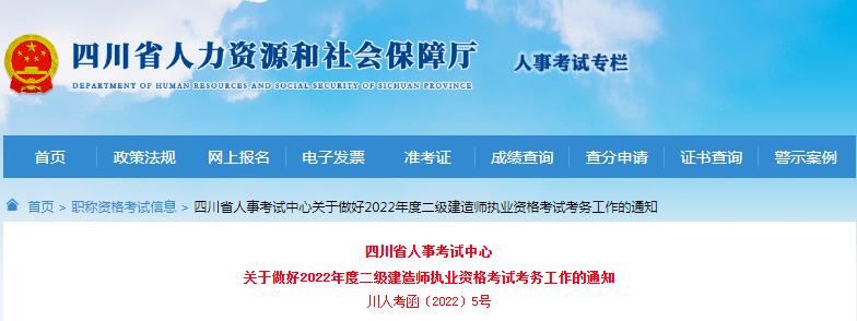根據(jù)四川省人力資源和社會保障廳《關于印發(fā)四川省2022年度專業(yè)技術人員資格考試工作計劃的通知》(川人社廳辦發(fā)〔2022〕10號)、四川省人力資源和社會保障廳《關于做好我省專業(yè)技術人員資格考試告知承諾制有關工作的通知》(川人社辦發(fā)〔2020〕14號)以及四川省人力資源和社會保障廳、四川省住房和城鄉(xiāng)建設廳《關于做好我省二級建造師執(zhí)業(yè)資格考試工作的通知》(川人社辦發(fā)〔2014〕4號)等文件精神,為切實做好我省2022年度二級建造師執(zhí)業(yè)資格考試考務工作,現(xiàn)將有關事項通知如下: