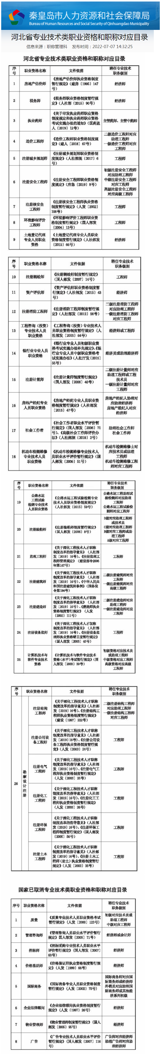 秦皇島人社局公布《河北省專業(yè)技術(shù)類職業(yè)資格和職稱對應(yīng)目錄》,序號第23號明確一級建造師對應(yīng)工程師。
