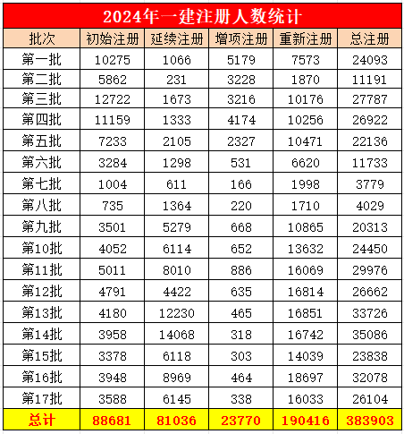 2024年住建部公布了第1-17批注冊(cè)數(shù)據(jù),2024年一級(jí)建造師注冊(cè)人數(shù)383903人,具體如下: