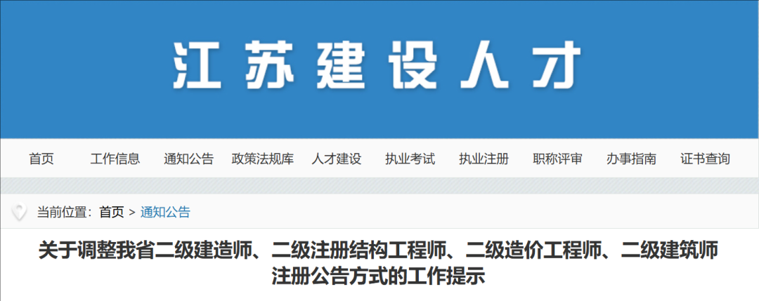 近江蘇發(fā)了一則通知,調(diào)整了二級(jí)建造師注冊(cè)公告方式。江蘇地區(qū)也出成績(jī)不久,很多考生詢(xún)問(wèn)注冊(cè)相關(guān)事宜,一起來(lái)看~