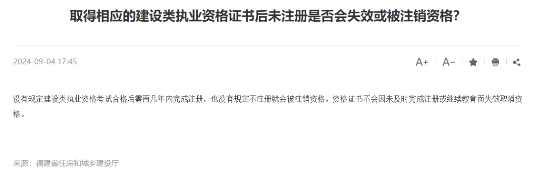 近日,福建省住建廳就“取得相應(yīng)的建設(shè)類執(zhí)業(yè)資格證書后未注冊是否會失效或被注銷資格?”的問題進行了回復(fù)。