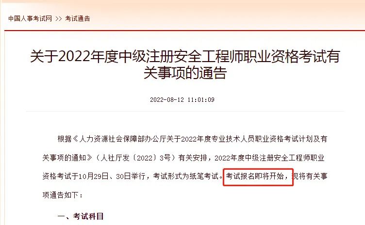 根據(jù)《人力資源社會保障部辦公廳關(guān)于2022年度專業(yè)技術(shù)人員職業(yè)資格考試計劃及有關(guān)事項的通知》(人社廳發(fā)〔2022〕3號)有關(guān)安排,2022年度中級注冊安全工程師職業(yè)資格考試于10月29日、30日舉行,考試形式為紙筆考試。考試報名即將開始,現(xiàn)將有關(guān)事項通告如下: