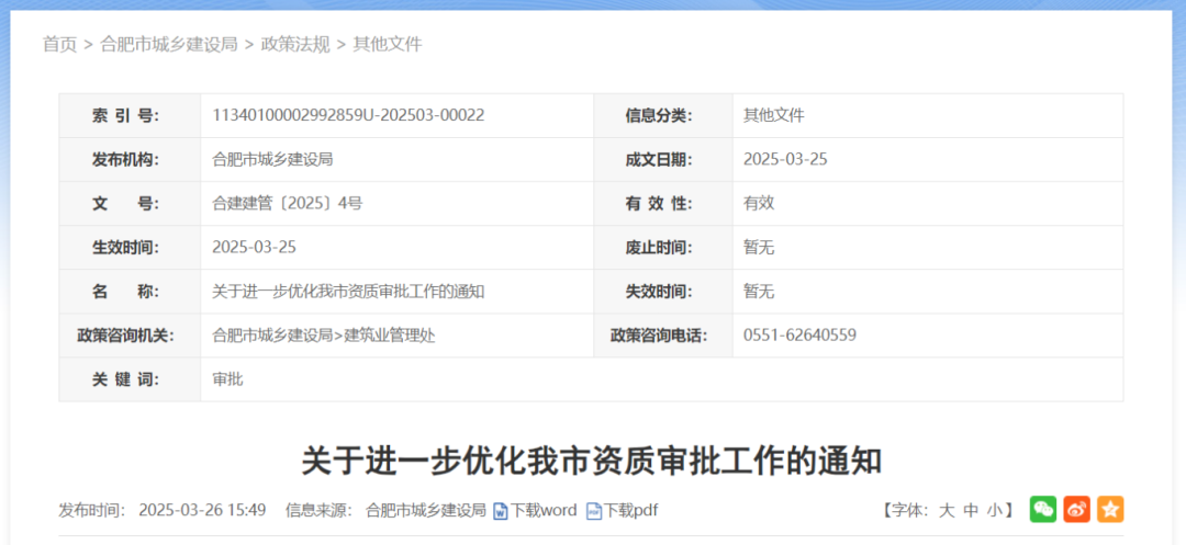 2025年3月,合肥市住建局發(fā)布《關(guān)于進(jìn)一步優(yōu)化我市資質(zhì)審批工作的通知》(合建建管〔2025〕4號(hào))