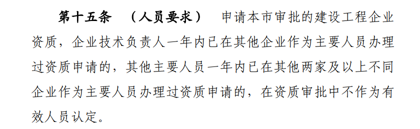 第十五條 (人員要求) 申請(qǐng)本市審批的建設(shè)工程企業(yè)資質(zhì),企業(yè)技術(shù)負(fù)責(zé)人一年內(nèi)已在其他企業(yè)作為主要人員辦理過資質(zhì)申請(qǐng)的,其他主要人員一年內(nèi)已在其他兩家及以上不同企業(yè)作為主要人員辦理過資質(zhì)申請(qǐng)的,在資質(zhì)審批中不作為有效人員認(rèn)定。