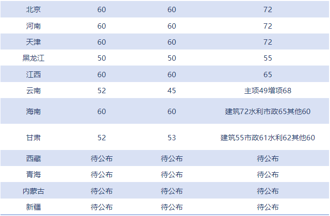 同時,以上大部分地區(qū)的二建合格線也已公布,另外西藏、青海、內蒙古、新疆的二建合格標準需待有關部門確定后另行公布。