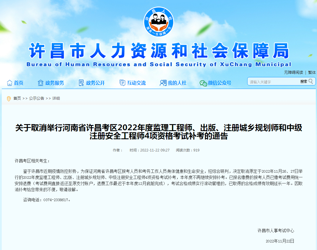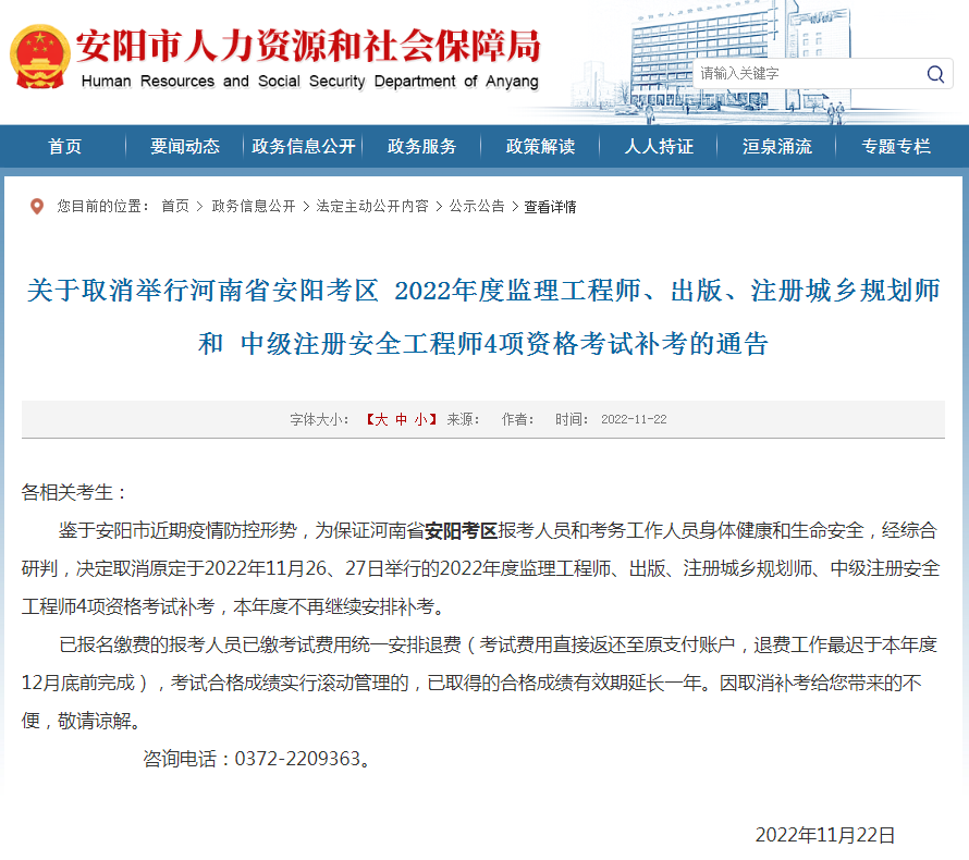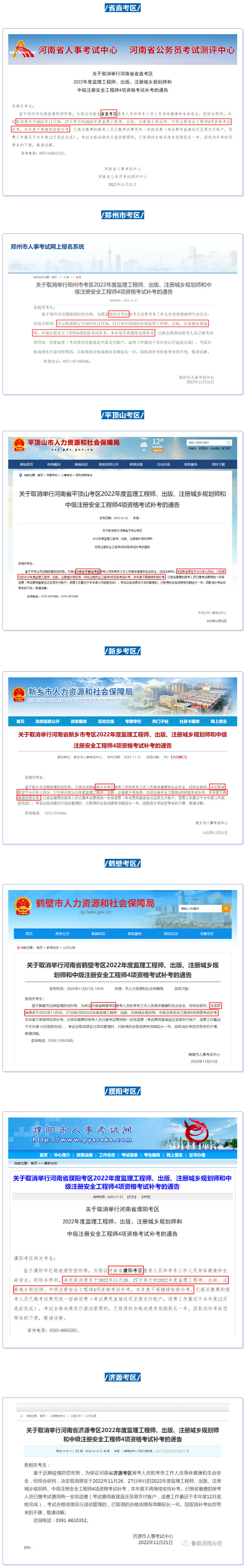 河南省省直、鄭州市、平頂山、新鄉(xiāng)、鶴壁、濮陽、濟(jì)源、洛陽、許昌、安陽、三門峽相繼宣布取消舉行2022年度監(jiān)理工程師、中級注冊安全工程師等4項資格考試補(bǔ)考。