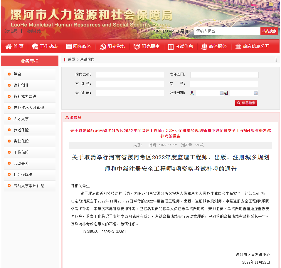 11月22日漯河市人力資源和社會保障局發(fā)布了《關于取消舉行河南漯河考區(qū) 2022年度監(jiān)理工程師、出版、注冊城鄉(xiāng)規(guī)劃師和 中級注冊安全工程師4項資格考試補考的通告》,取消舉行河南漯河考區(qū) 2022年度監(jiān)理工程師、出版、注冊城鄉(xiāng)規(guī)劃師和 中級注冊安全工程師4項資格考試補考,本年度不再安排補考且無法調劑到其他地區(qū)考試,12月底完成統(tǒng)一退費。