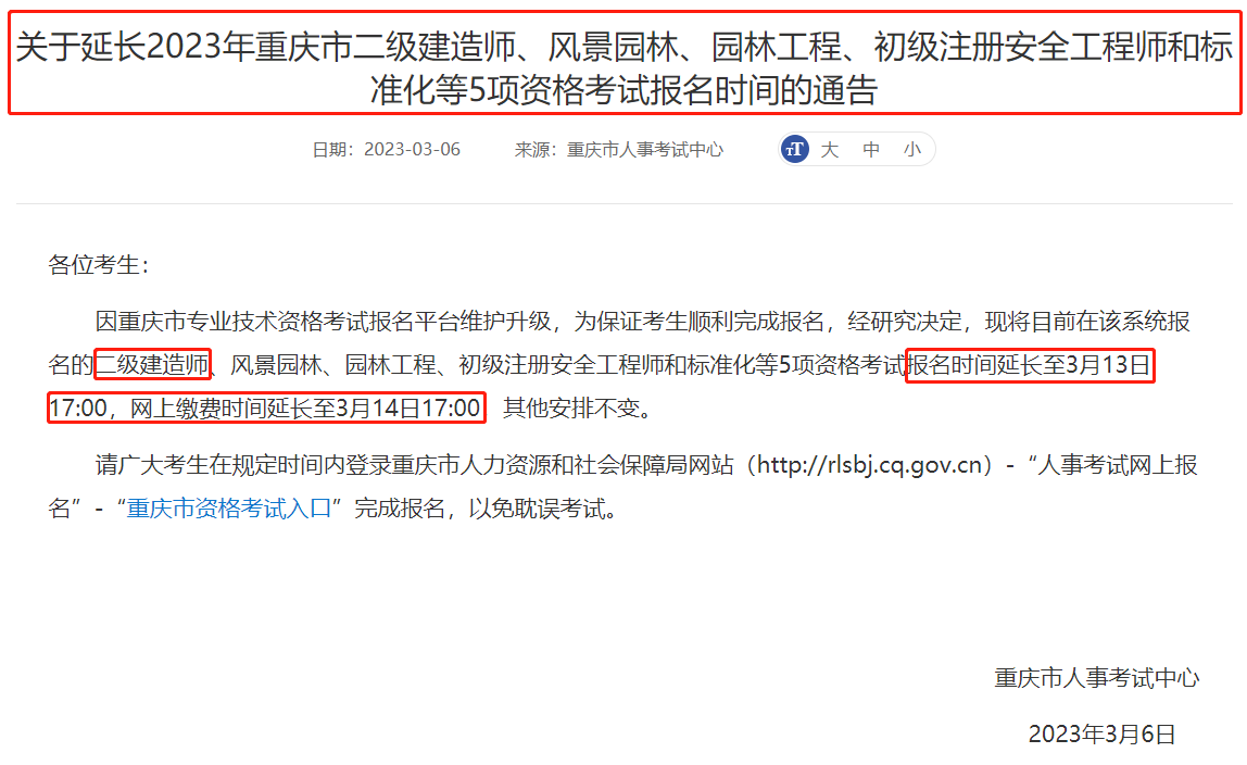 重慶市報名的二級建造師等5項資格考試報名時間延長至3月13日17:00,網(wǎng)上繳費時間延長至3月14日17:00,其他安排不變。
