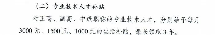 2023年11月1日后新來(lái)徐州市區(qū)企業(yè)就業(yè)參保的,40周歲以下(含40 周歲)具有正高級(jí)、副高級(jí)、中級(jí)職稱的專業(yè)技術(shù)人才,分別給予每月3000元、1500元、1000元的生活補(bǔ)貼,最長(zhǎng)領(lǐng)取3年。