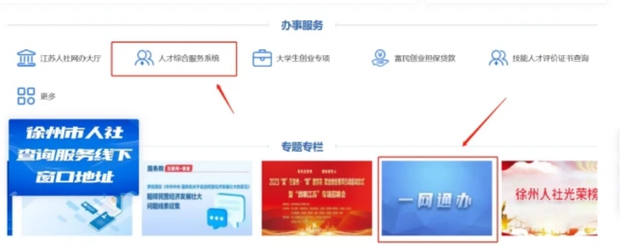 1.用人單位電腦端使用瀏覽器搜索“徐州市人力資源和社會(huì)保障網(wǎng)”(http://hrss.xz.gov.cn/),點(diǎn)擊官網(wǎng)首頁(yè)最下面“人才綜合服務(wù)系統(tǒng)”或圖標(biāo)“一網(wǎng)通辦”后,選擇對(duì)應(yīng)入口進(jìn)行登錄。