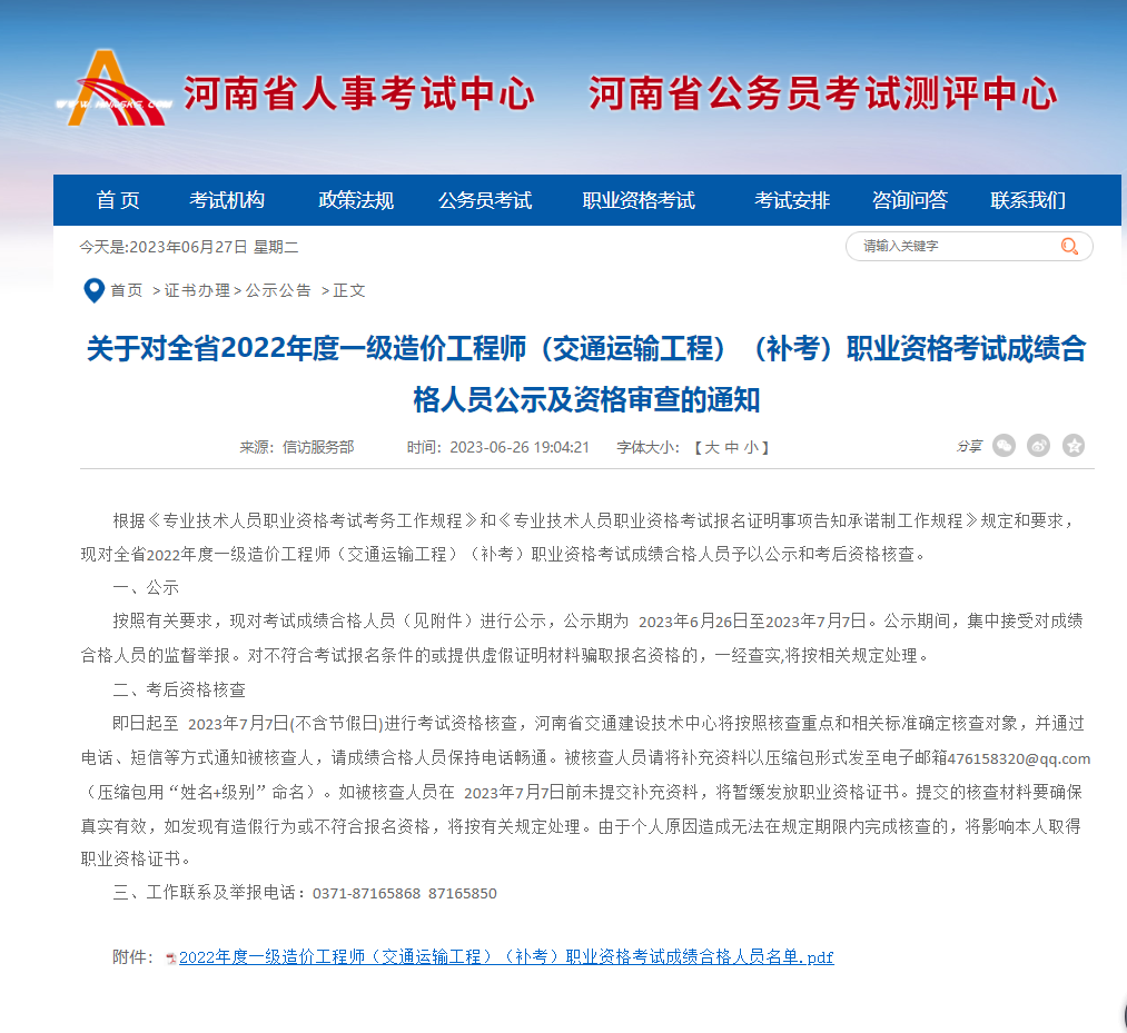 河南人事考試中心今天也發(fā)布了交通運(yùn)輸工程的考后資格審查通知