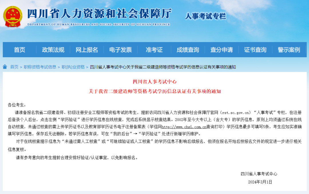 關(guān)于我省二級建造師等資格考試學(xué)歷信息認證有關(guān)事項的通知