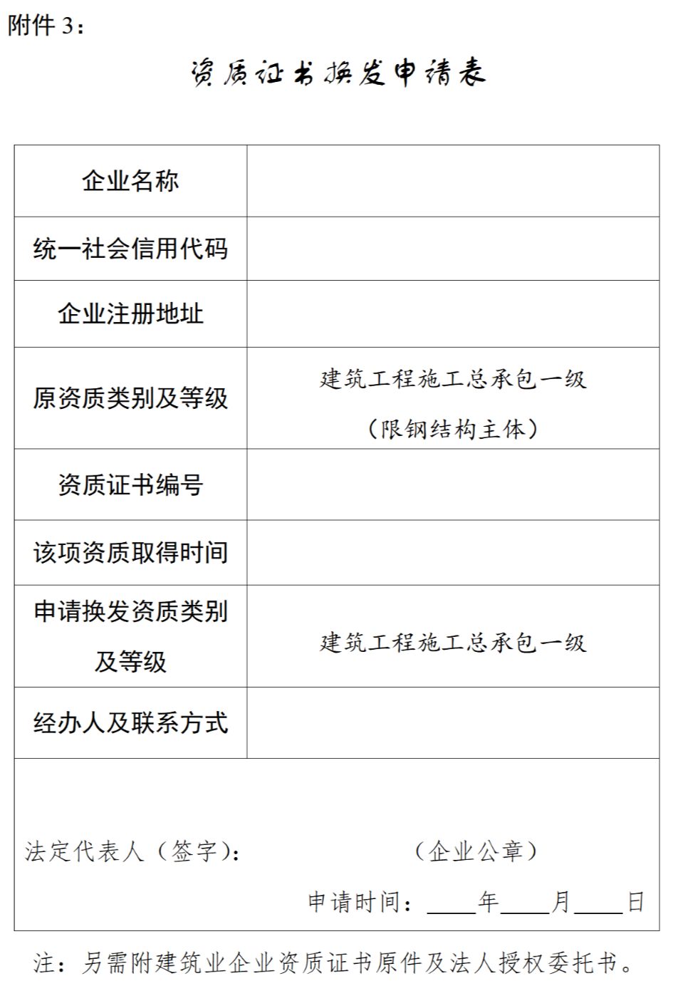 二、具有建筑工程施工總承包一級資質(zhì)(限鋼結(jié)構(gòu)主體工程)的建筑業(yè)企業(yè),可提交《資質(zhì)證書換發(fā)申請表》(見附件3),申請換發(fā)建筑工程施工總承包一級資質(zhì)證書。