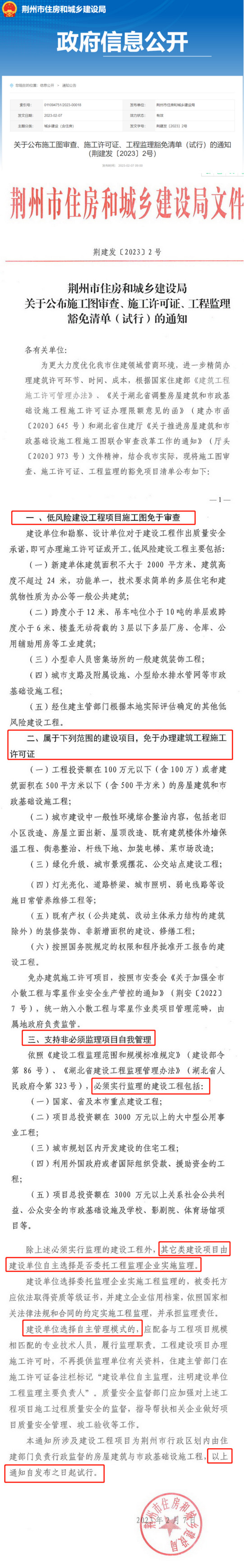 2月7日,荊州市住建局公布施工圖審查、施工許可證、工程監(jiān)理豁免清單(試行),自發(fā)布之日起試行。